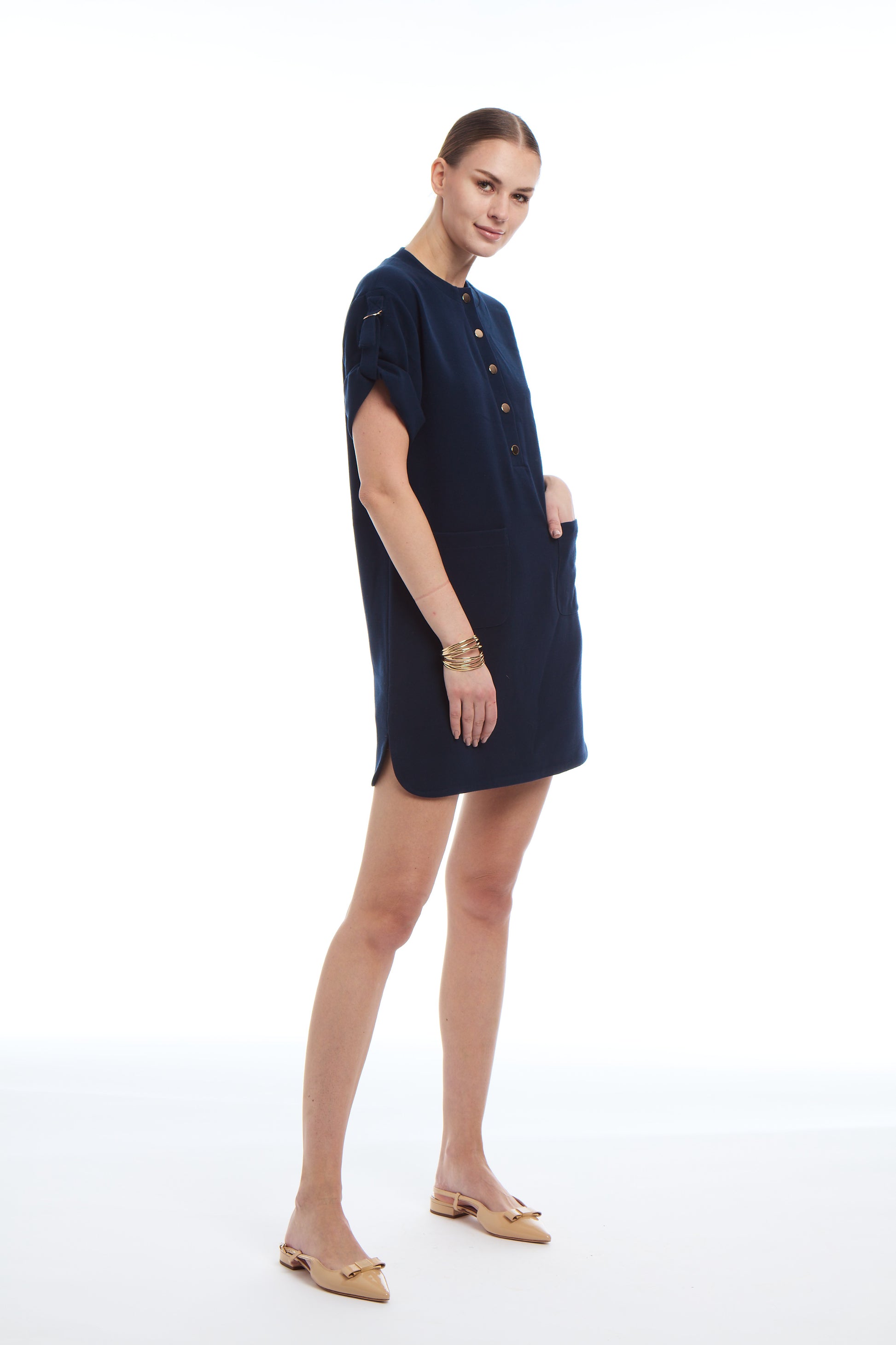 Louise Dress with buckle sleeve detail. Imported fabric from Italy with patch pockets . Fully Lined.
