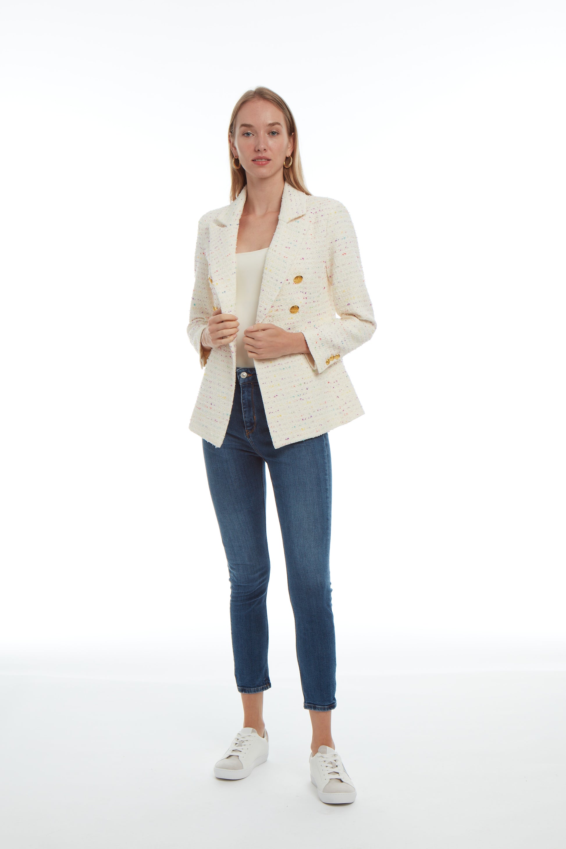 Imported fabric from Lyon, France. Cotton blend. Confetti tweed jacket in our best selling Bermuda style with gold buttons. Final sale, no returns or exchanges.